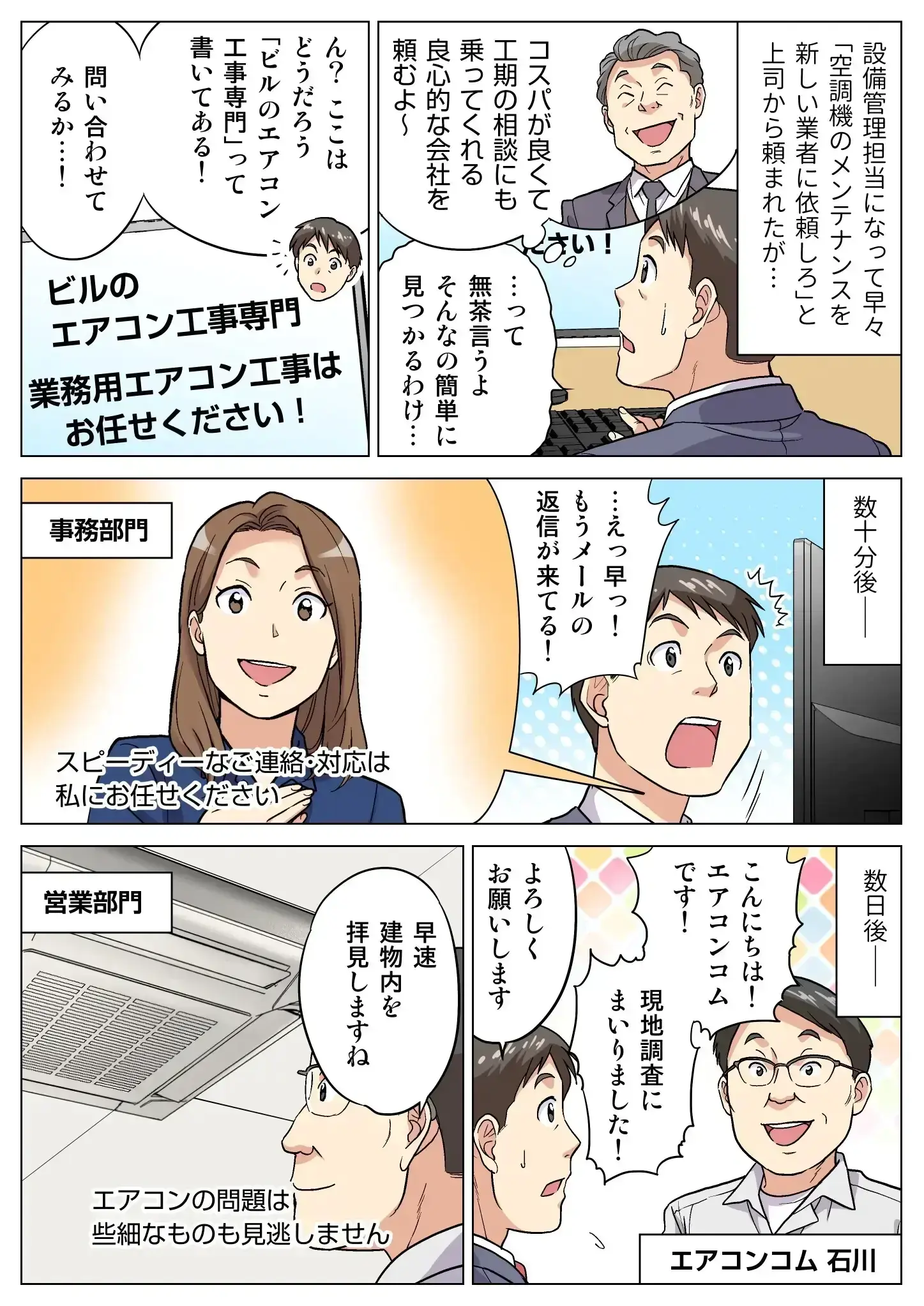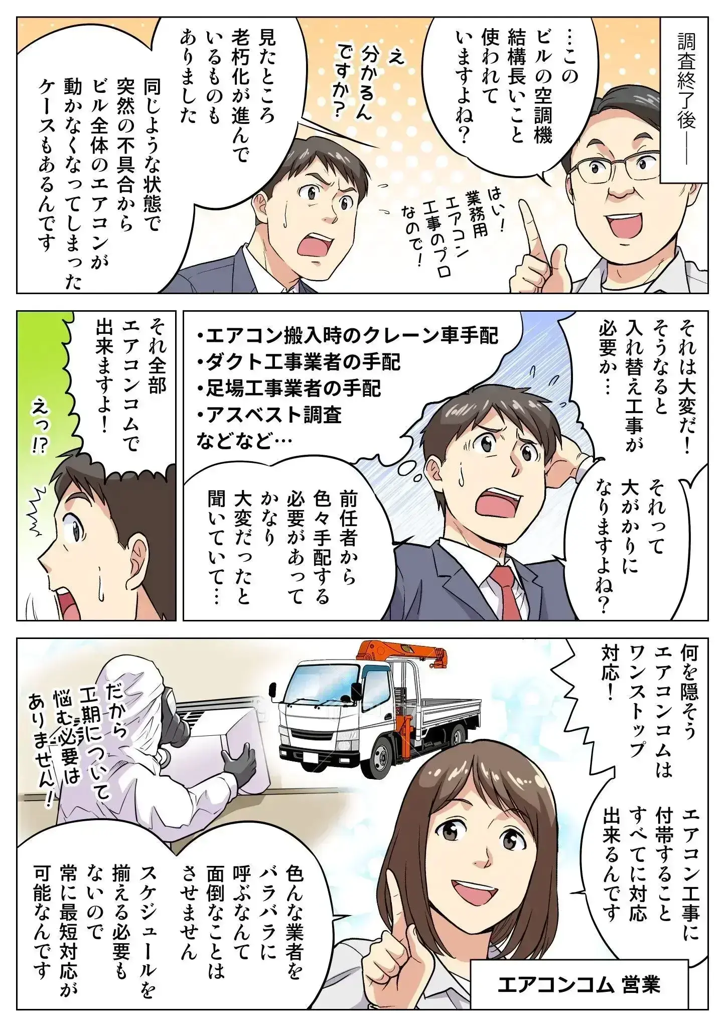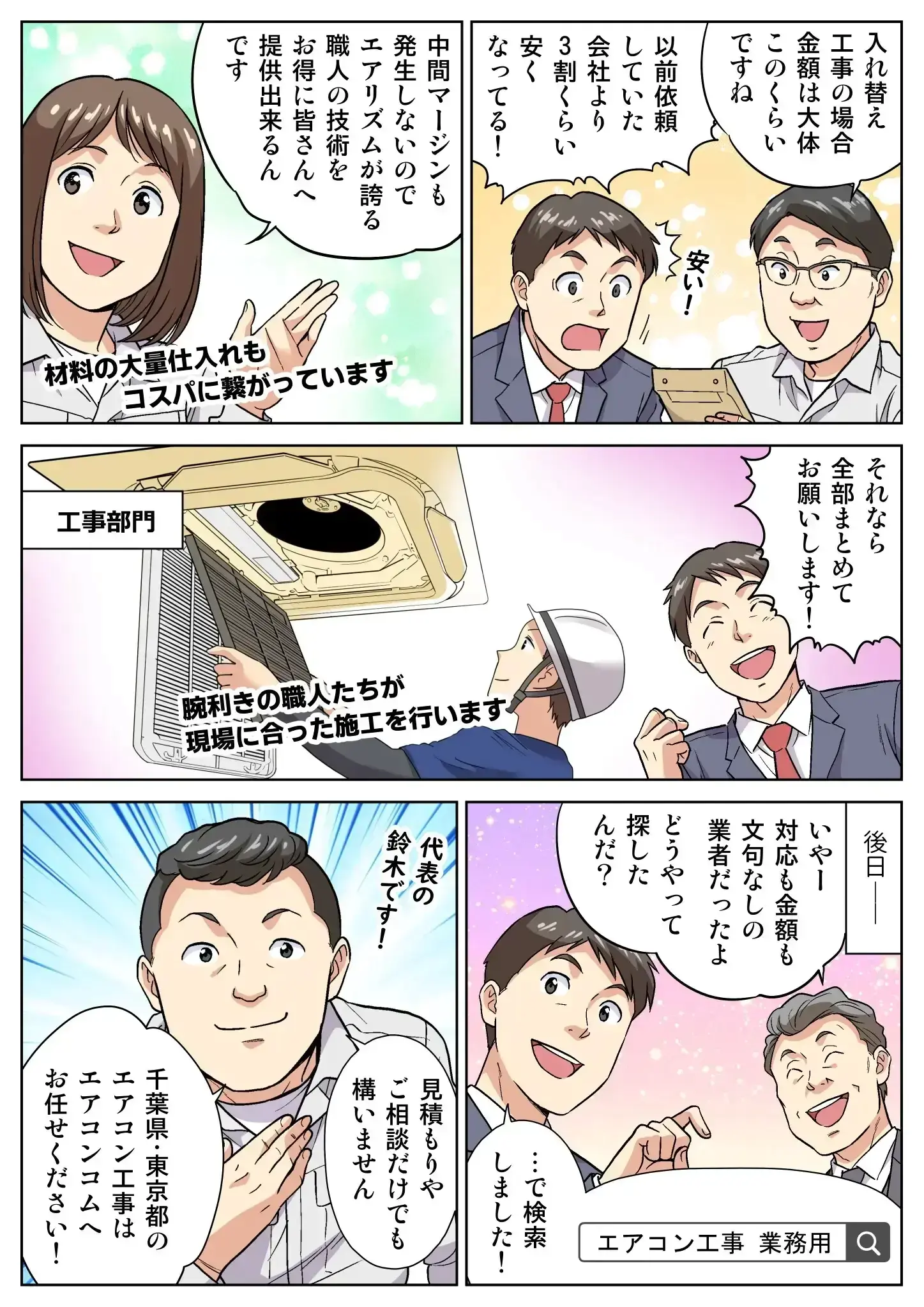 エアコンコムは、千葉・東京を中心に関東全域でサービスを提供。ビルや大型施設の空調工事、アフターサービスを一貫して行い、迅速かつ高品質な対応を常に心掛けています。